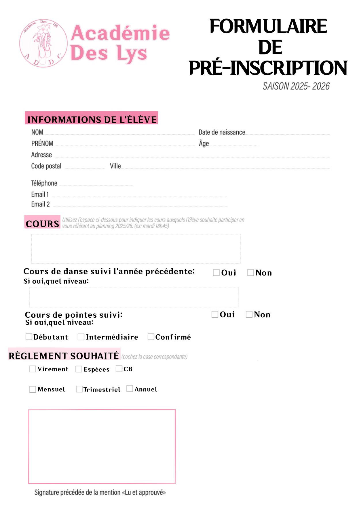 Les pré-inscriptions pour la saison 2025/2026 sont ouvertes jusqu'au 10 août 2025. Les élèves pré-inscrits bénéficieront d'une priorité sur les places disponibles.